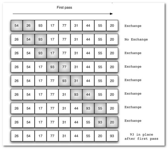 def bubble_sort(alist): for j in range(len(alist)-1,0,-1): # j表示每次遍历需要比较的次数,是逐渐减小的 for i in range(j): if alist[i] > alist[i+1]: alist[i], alist[i+1] = alist[i+1], alist[i] li = [54,26,93,17,77,31,44,55,20] bubble_sort(li) print(li)