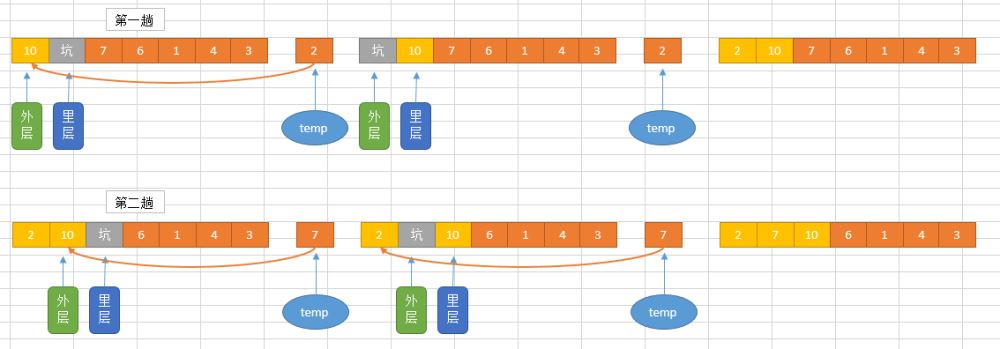 红色表示当前最小值,黄色表示已排序序列,蓝色表示当前位置。