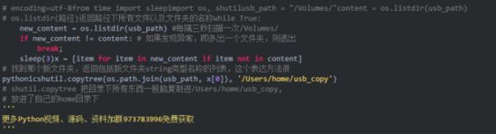 我的设计是这样的,用time.sleep(3)函数,让程序保持运行状态,并且每隔三秒查看一下/Volumes/目录,如果多出来文件夹,就将其拷贝到另外的文件夹。
