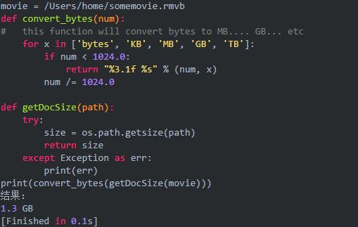 os.path.getsize(文件名)返回的是一个单位为byte的数值,如果用来查看文件大小,我们则需要手动写一个函数,将其换算成容易阅读的形式。