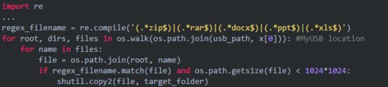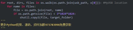 刚刚我们写了一个很简易的脚本测试了一下这个想法的可行性,但是还是有问题。刚才之所以能把U盘中所有文件很快复制进去,是因为U盘中只有两三个文件,大小不超过15M。如果目标U盘中有很多电影,音乐,这些我们并不需要的文件,我们的程序就应该能跳过它们,仅仅选择一些重要的比如.docx比如.ppt文件,或者仅仅复制最近修改过的那些文件,或者排除所有大小大于5M的文件。我们可以用python做到吗?当然!