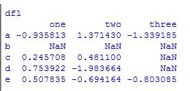 df = pd.DataFrame(np.random.randn(5, 3), index = list('abcde'), columns = ['one', 'two', 'three']) # 随机产生5行3列的数据