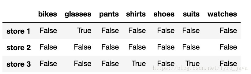 .isnull() 方法返回一个大小和 store_items 一样的布尔型 DataFrame,并用 True 表示具有 NaN 值的元素,用 False 表示非 NaN 值的元素。