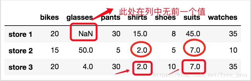 注意 store 3 中的两个 NaN 值被替换成了它们所在列中的上个值。