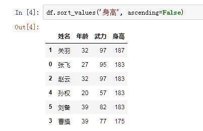 我们用到的是df.sort_values()这个函数。第一个参数为by,传入你要排序的列的标签名即可,后面的ascending参数指示排序方法为升序还是降序,True为升序,False为降序。由于存在相同的身高,pandas会自动的比较两个相同身高所对应的index,按照index的升序来排列。