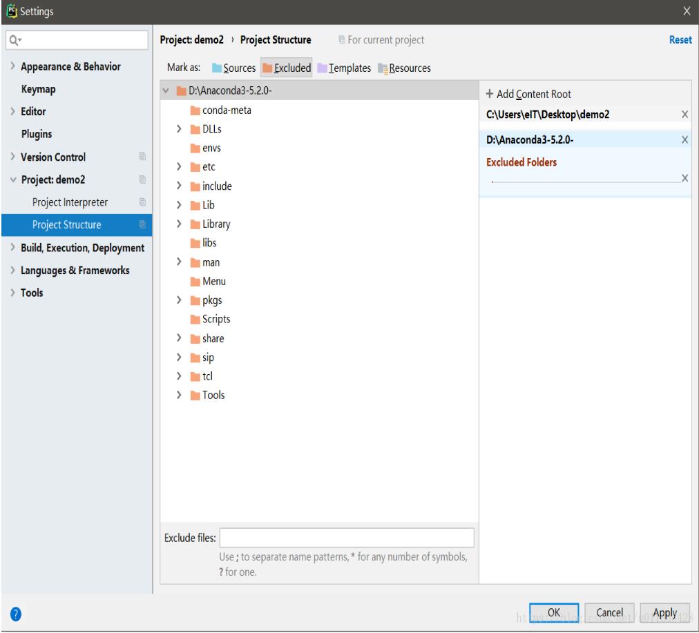 file >>setting>> Project >>Project Structure 点击add content root把anaconda的文件目录加入进去,然后设置为Excluded