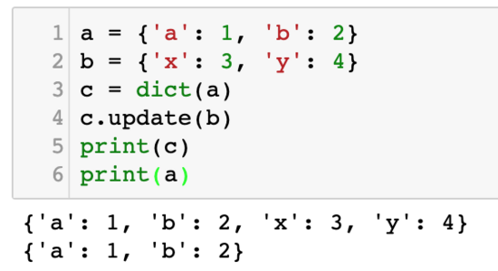 然而,这个方法有一个问题——它会改变其中一个字典。如果我们不想改变原有的两个字典,那么我们必需要单独再创建一个字典: