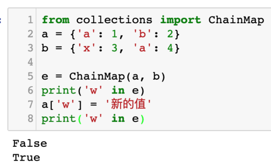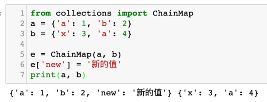 使用 ChainMap 可以把多个字典合并成一个 ChainMap 对象。读写这个对象就像是读字典一样。