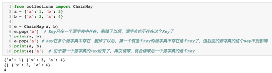 第四个问题,如果这个Key只在一个源字典中存在,那么这个Key会被从源字典中删除。如果这个Key在多个字典中都存在,那么Key会被从第一个字典中删除。当被从第一个字典中删除以后,第二个源字典的Key可以继续被 ChainMap 读取。