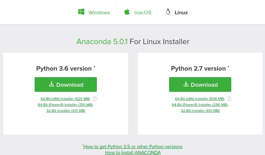 PackageManager我们选择conda,于是我们需要安装Anaconda这个功能强大的包,下载地质:https://www.anaconda.com/download/ 。里面包含了conda工具,也有Python,以及很多Python需要的扩展工具包。选择2.7版本,下载并安装即可。接下来,如果有显卡,进入第3步;没有显卡直接到第4步。