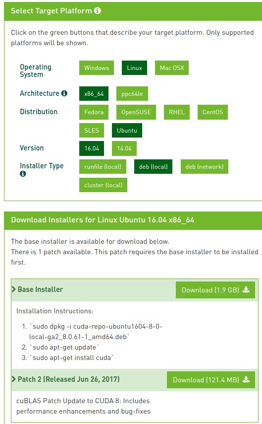 接下来安装CUDAToolkit。因为最新的CUDA是9.0版本,但是PyTorch只能支持到8.0。所以转到该网址“https://developer.nvidia.com/cuda-80-ga2-download-archive”,选择对应的参数,下方会有对应的CUDA文件。例如,下图是我选择的版本。选择deb文件,发现有1.9G大小,下载下来,按照baseinstaller的指示来完成安装。附加的cuBLAS也可以下载下来安装上。