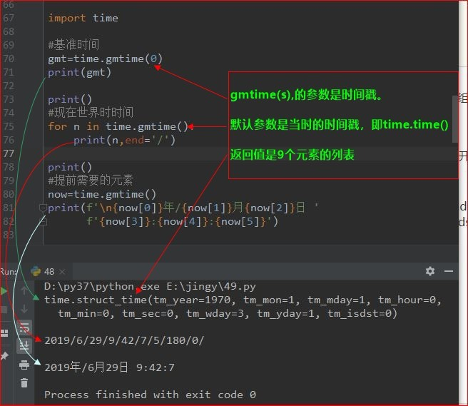 gmt=time.gmtime(0) print(gmt) ---time.struct_time(tm_year=1970, tm_mon=1, tm_mday=1, tm_hour=0, tm_min=0, tm_sec=0, tm_wday=3, tm_yday=1, tm_isdst=0)print()