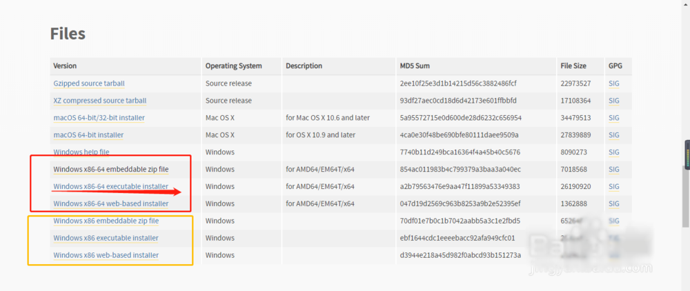 如下图,红色框是win的64位,黄色框是win32位,我点击下载的是红色箭头链接。