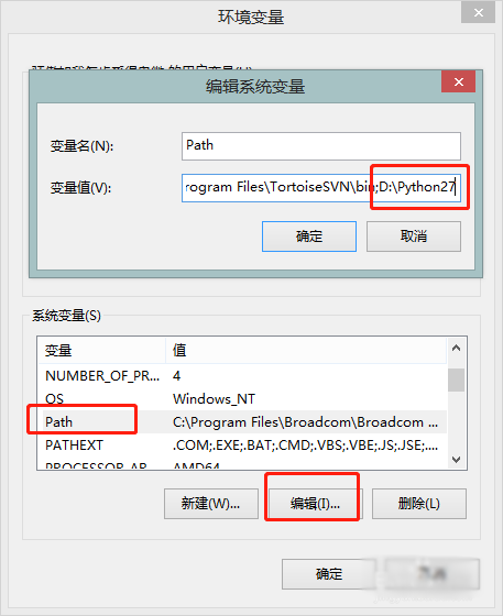 配置环境变量:这台电脑->属性->高级系统设置->高级->环境变量,找到Path进行编辑在最后加入";D:\Python27",此路径是你安装Python的路径