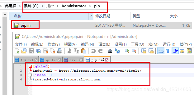 首先在 windows 当前用户家的目录下,创建一个 pip 文件夹,然后创建一个pip.ini文件,修改文件内容为如下;