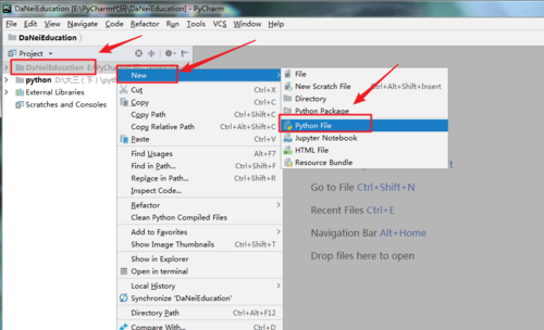 第一步:先打开我们的pycharm软件,然后新建一个python文件。“file”,“new”,“python file”