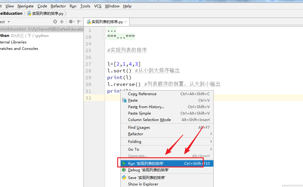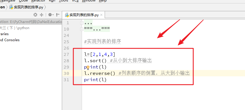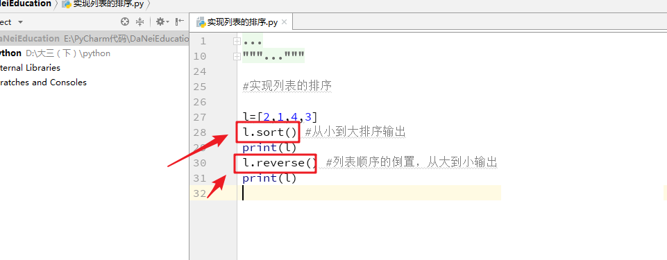 这次代码主要是实现列表的排序,使用sort函数实现,sort函数是对列表中的元素按照特定顺序进行排序,默认reverse,为false,从小到大排序, 如果指定reverse=True,从大到小。 语法格式:l.sort(),希望对你们有所帮助