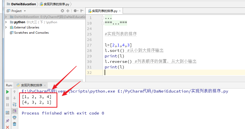 l=[2,1,4,3] l.sort() #从小到大排序输出 print(l) l.reverse() #列表顺序的倒置,从大到小输出 print(l)
