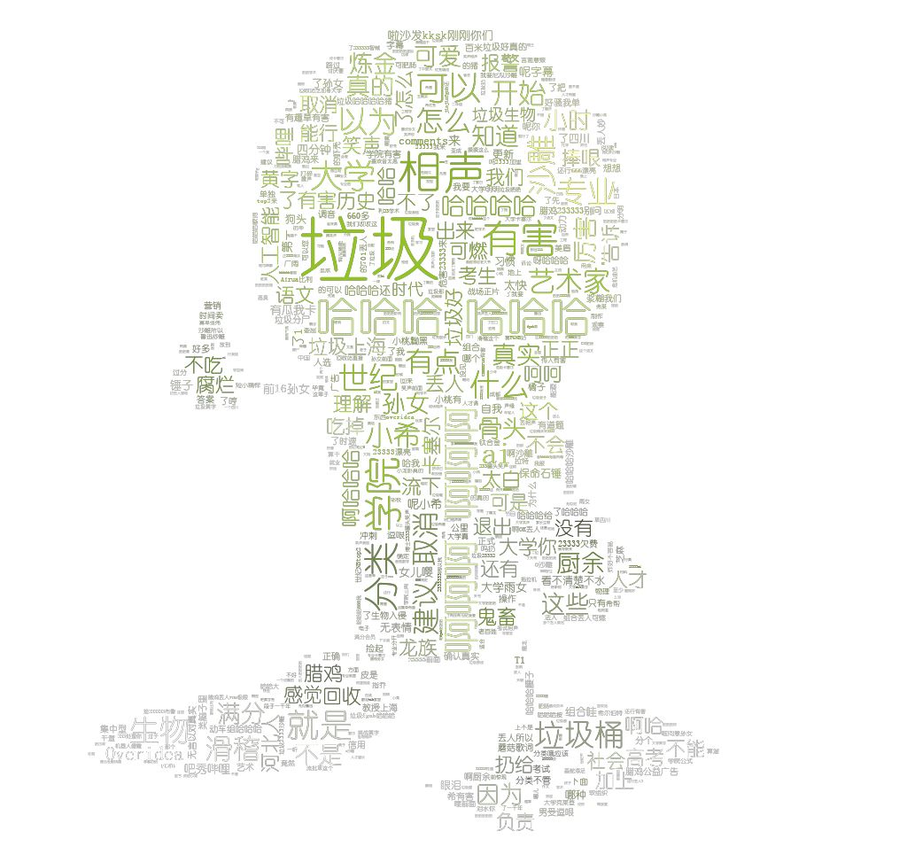 我们可以自行选择一张图片,并基于此图片来生成一张定制的词云图。我们可以自定义一些词云样式,代码如下: