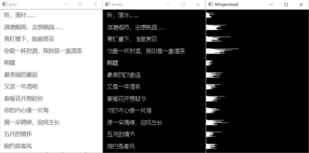 通过上面的水平投影,根据其白色小山峰的起始位置就可以界定出每一行的起始位置,从而把每一行分割出来。