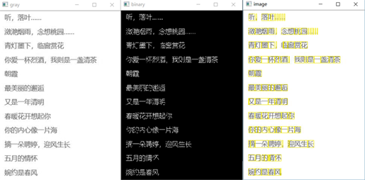 从分割的结果上看,基本上实现了图片中文字的分割。但由于中文结构复杂性,对于一些文字的分割并不理想,比如“叶”、“桃”等字会出现过度分割现象;对于有粘连的两个字会出现分割不够的现象,比如上图中的“念想”。不过可以从图像预处理(腐蚀),边界判断阈值的调整等方面进行优化。