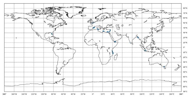 第二部分是标注出经纬度所在的地点,这部分比第一步简单多了,直接用scatter()方法就可以了,代码如下: