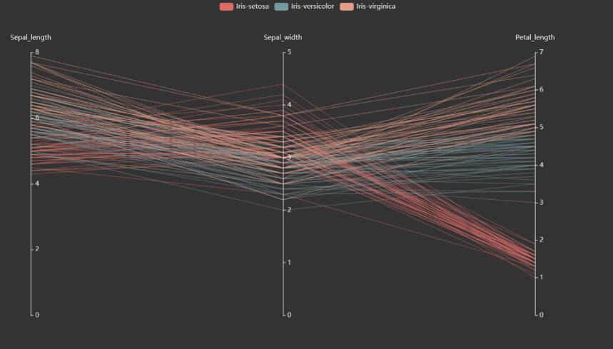 平行坐标图,一种数据可视化的方式。以多个垂直平行的坐标轴表示多个维度,以维度上的刻度表示在该属性上对应值,相连而得的一个折线表示一个样本,以不同颜色区分类别。