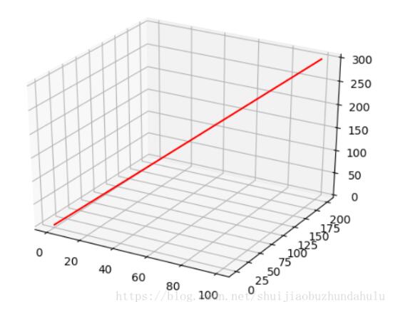 from mpl_toolkits.mplot3d import axes3d import matplotlib.pyplot as plt # 打开画图窗口1,在三维空间中绘图 fig = plt.figure(1) ax = fig.gca(projection='3d') # 给出点(0,0,0)和(100,200,300) x = [0, 100] y = [0, 200] z = [0, 300] # 将数组中的前两个点进行连线 figure = ax.plot(x, y, z, c='r') plt.show()