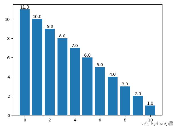 import numpy as np import matplotlib.pyplot as plt # 生成测试数据 x = np.linspace(0, 10, 10) y = 11-x # 绘制柱状图 plt.bar(x, y) # 循环,为每个柱形添加文本标注 # 居中对齐 for xx, yy in zip(x,y): plt.text(xx, yy+0.1, str(yy), ha='center') # 显示图形 plt.show()
