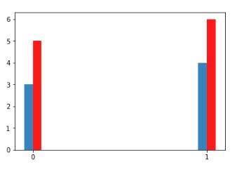 import numpy as np x = [1,2] #横坐标 y = [3,4] #第一个纵坐标 y1 = [5,6] #第二个纵坐标 x = np.arange(len(x)) #首先用第一个的长度作为横坐标 width = 0.05 #设置柱与柱之间的宽度 fig,ax = plt.subplots() ax.bar(x,y,width,alpha = 0.9) ax.bar(x+width,y1,width,alpha = 0.9,color= 'red') ax.set_xticks(x +width/2)#将坐标设置在指定位置 ax.set_xticklabels(x)#将横坐标替换成 plt.show()