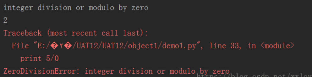 try: a = 2 b = 0 print a / b except ZeroDivisionError as e : print e.message #捕获异常信息 print '出错啦!!!' print 1111