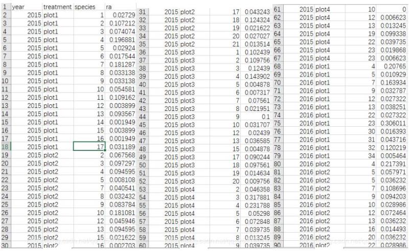 这里展示了部分数据,主要是treatment就是对应的上图分类一,分类二;species就是对应的分组;ra就是对应的各个分组的比例。