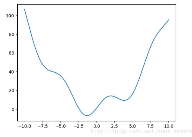 import numpy as np from matplotlib import pyplot as plt from scipy.optimize import fmin,fminbound def f(x): return x**2+10*np.sin(x)+1 x=np.linspace(-10,10,num=500) min1=fmin(f,3)#求3附近的极小值 min2=fmin(f,0)#求0附近的极小值 min_global=fminbound(f,-10,10)#这个区域的最小值 print(min1) print(min2) print(min_global) plt.plot(x,f(x)) plt.show()
