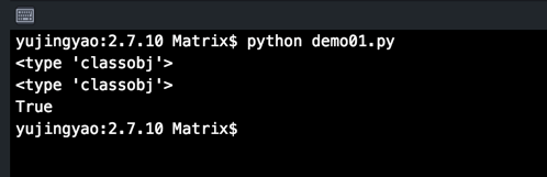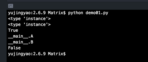 代码运行结果和Python 3.x是完全相同的,可以看出Python 2.x 新式类实例的类型就是这个实例所创建自的类。同时进一步印证在Python 3.x中所有的类都是新式类(显示或隐式继承自object类)。
