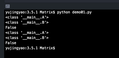 class A():pass class B():pass if __name__ == '__main__': print(type(A)) print(type(B)) print(type(A) == type(B))