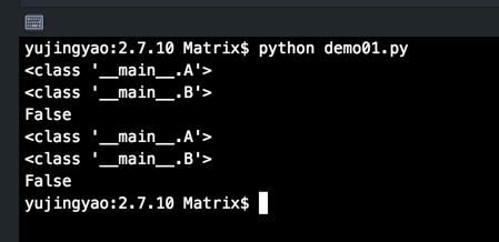 再次修改代码,使 class A 和 B 显式继承自 object,成为新式类,再在Python 2.7.10 下运行查看结果:
