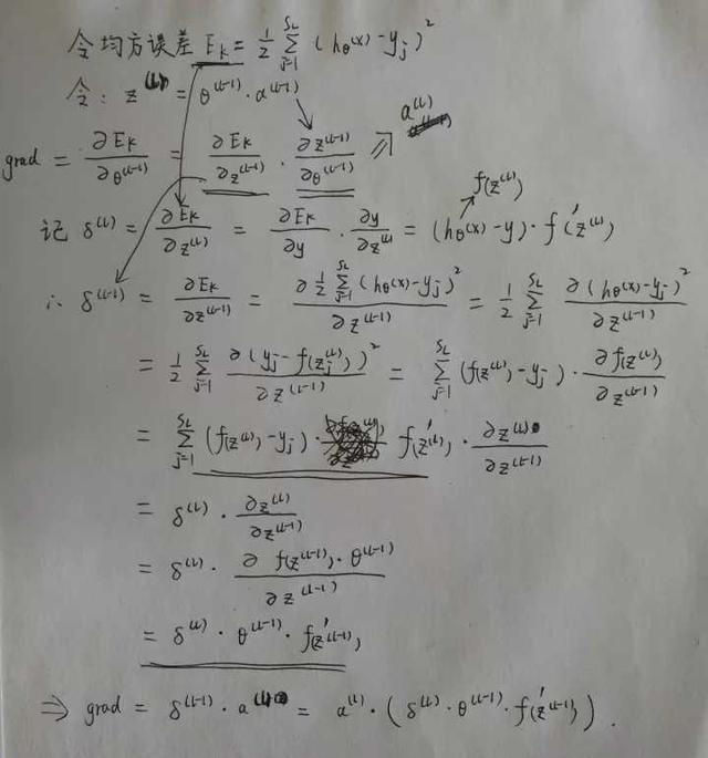 大体的推导过程如下,最终我们是想预测函数与已知的y非常接近,求均方差的梯度沿着此梯度方向可使代价函数最小化。可对照上面求梯度的过程。