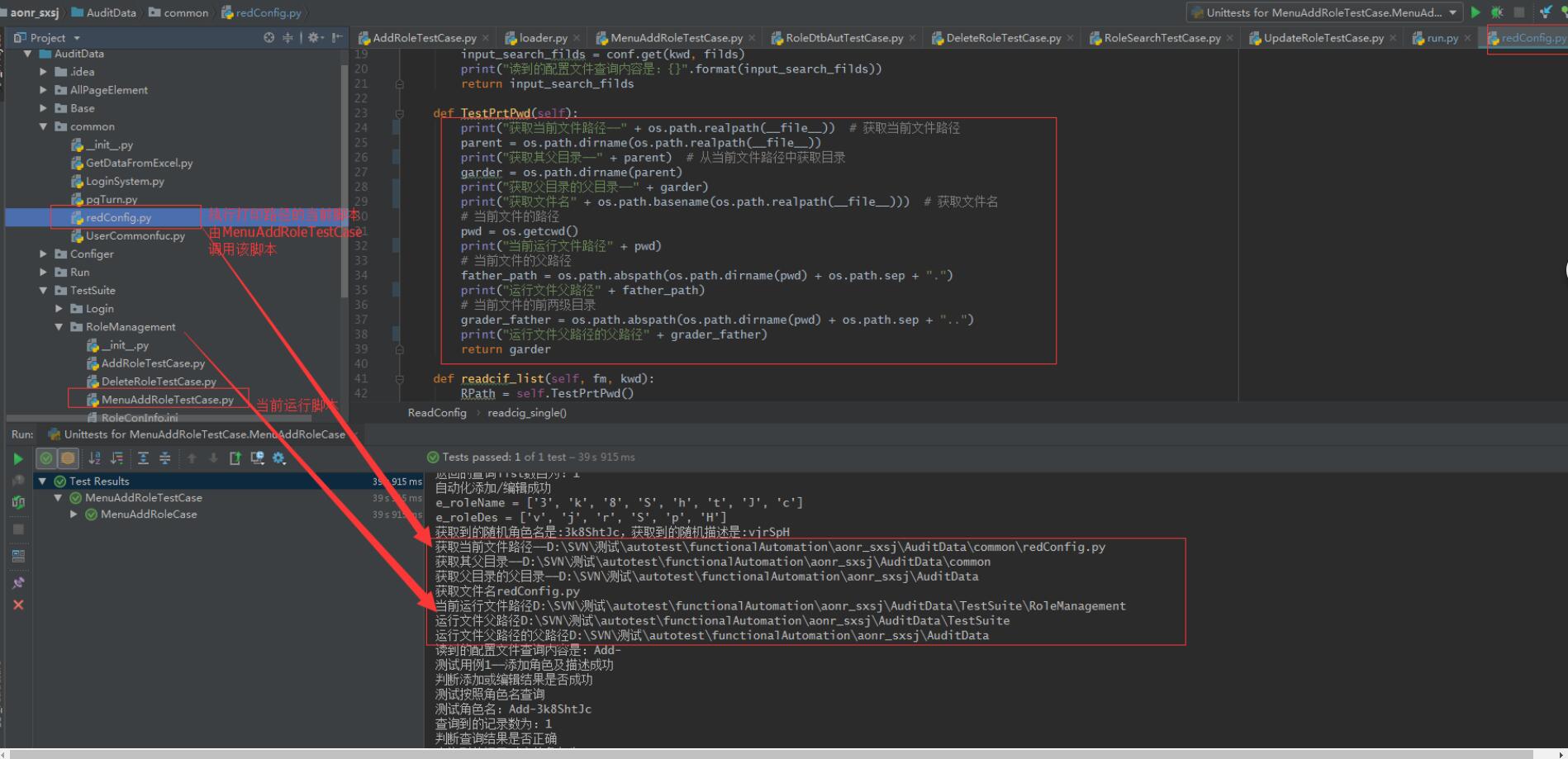 获取当前文件路径——D:\SVN\测试\autotest\functionalAutomation\aonr_sxsj\AuditData\common\redConfig.py 获取其父目录——D:\SVN\测试\autotest\functionalAutomation\aonr_sxsj\AuditData\common 获取父目录的父目录——D:\SVN\测试\autotest\functionalAutomation\aonr_sxsj\AuditData 获取文件名redConfig.py 当前运行文件路径D:\SVN\测试\autotest\functionalAutomation\aonr_sxsj\AuditData\TestSuite\RoleManagement 运行文件父路径D:\SVN\测试\autotest\functionalAutomation\aonr_sxsj\AuditData\TestSuite 运行文件父路径的父路径D:\SVN\测试\autotest\functionalAutomation\aonr_sxsj\AuditData