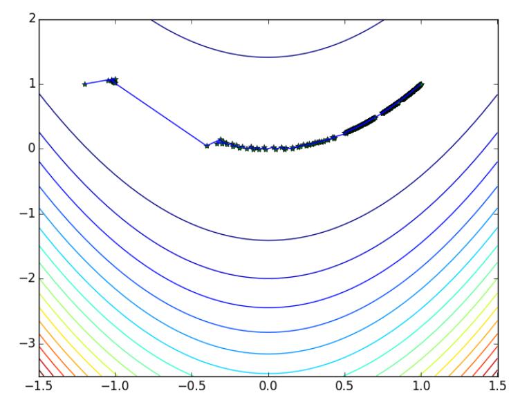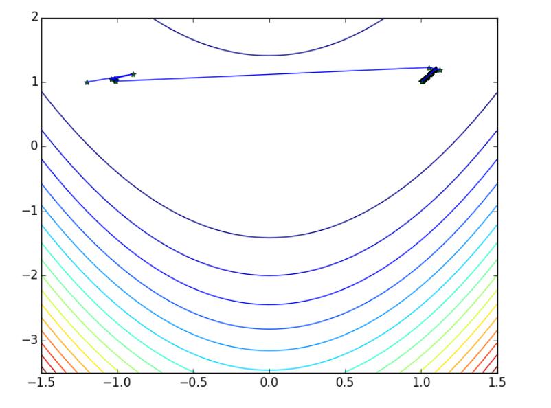 初始点为: [-1.2 1. ] 迭代次数为: 1504 近似最优解为: [ 1.00318532 1.00639618] 迭代点的轨迹为