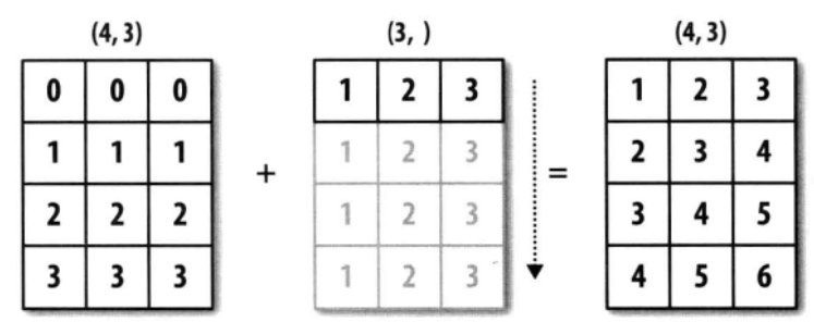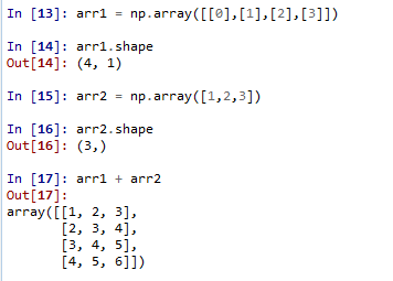 根据广播原则:arr1的shape为(4,1),arr2的shape为(3,),所以会同时在两个轴发生广播,arr1的shape变成(4,3),而arr2的shape变成(4,3),所以结果也为(4,3).