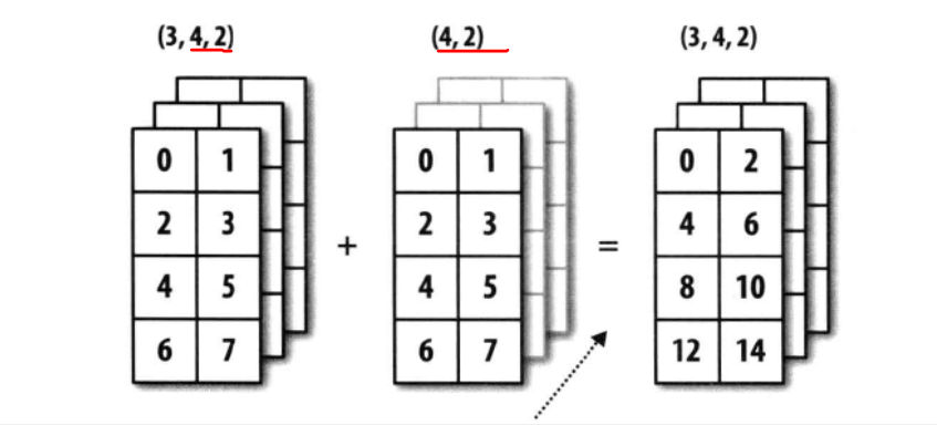 根据广播原则分析:arr1的shape为(3,4,2),arr2的shape为(4,2),它们的后缘轴长度都为(4,2),所以可以在0轴进行广播,arr2的shape变为(3,4,2).