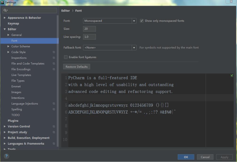 1. File->Setting 打开如下所示的对话框,可以在Editor->General->Font下设置字体大小(Size)、行距(Line spacing)