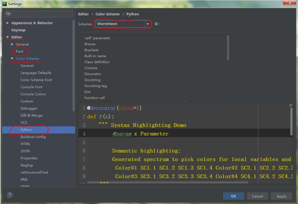 2. Editor->Color Scheme 展开如下所示内容,可以选择自己喜欢的主题样式,设置颜色等属性。