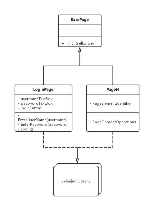 BasePage作为基类只包含一个driver成员变量,它用来标记Selenium中的WebDriver,以便在BasePage的派生类中定位页面元素。LoginPage和PageN等作为派生类,可以提供相应页面元素的定位和操作方法。比如测试对象的登录页面: