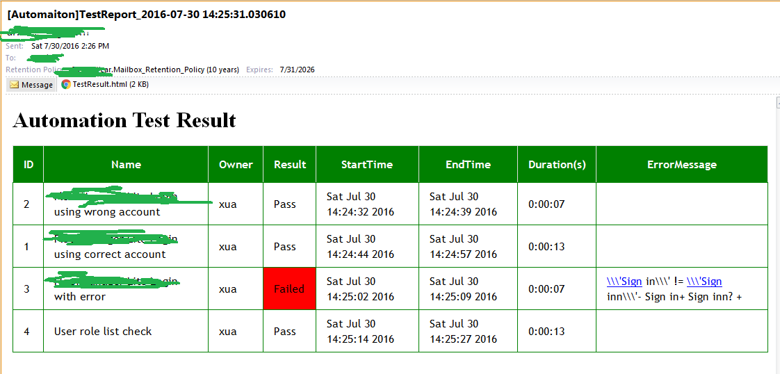 测试用例执行完毕后主要有两种输出:日志和测试报告。测试报告会html附件的形式通过邮件发出,例如: