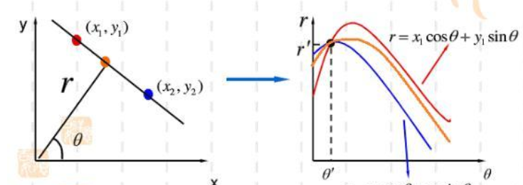 检验参数空间中每个累加器的值,累加器最大的单元所对应的ρ和θ即为直角坐标系中直线方程的参数。