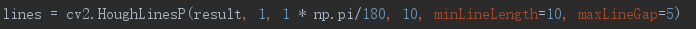 lines = cv2.HoughLinesP(result, 1, 1 * np.pi/180, 10, minLineLength=10, maxLineGap=5)