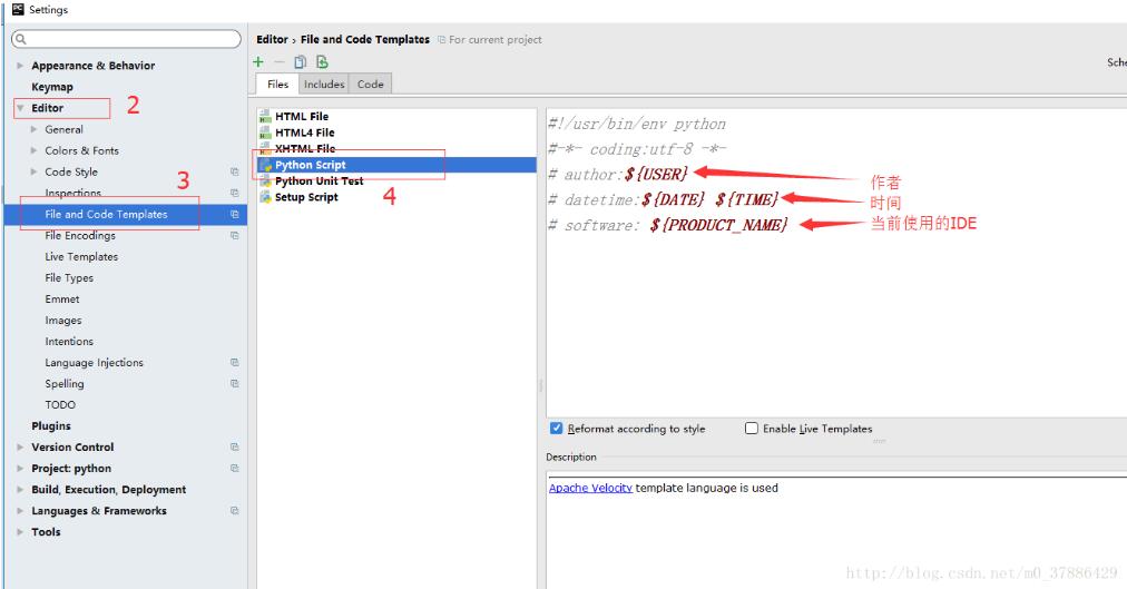 2.Editor –> File and Code Templates –> Python Script