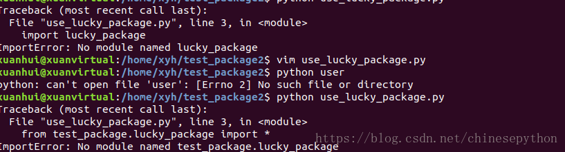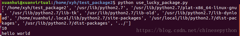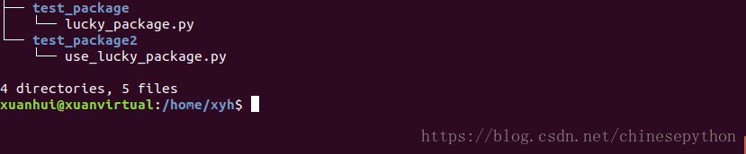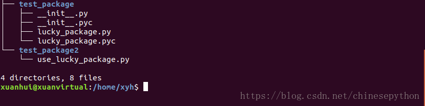 我的是创建在/home/xyh/test_package,下边是我的目录结构。要在另一个不相关的文件夹下的python应用中引用到我们自定义的包。就是在/home/xyh/test_package2/use_lucky_package.py中导入lucky_package.py这个包,测试直接import lucky_package.py或者直接from test_package import lucky_package.py是不行的。