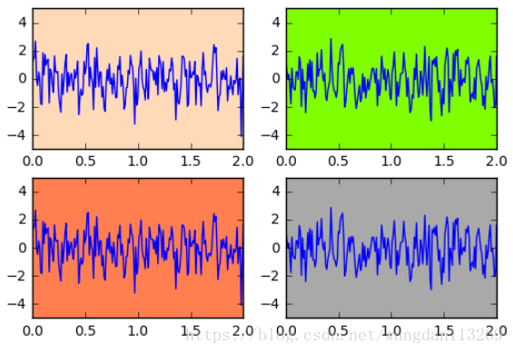 import matplotlib.pyplot as plt import numpy as np # Fixing random state for reproducibility np.random.seed(19680801) dt = 0.01 t = np.arange(0, 30, dt) nse1 = np.random.randn(len(t)) # white noise 1 nse2 = np.random.randn(len(t)) # white noise 2 s1 = np.sin(2 * np.pi * 10 * t) + nse1 s2 = np.sin(2 * np.pi * 10 * t) + nse2 s3 = np.sin(2 * np.pi * 10 * t) + nse1 s4 = np.sin(2 * np.pi * 10 * t) + nse2 fig= plt.figure(1) # 创建图表1 axs0=plt.subplot(221,axisbg='#FFDAB9') #在图标1中创建子图 axs0.plot(t, s1) #横轴与纵轴数据 axs0.set_xlim(0, 2) #限制x轴的取值范围 axs1=plt.subplot(222,axisbg='#7FFF00') axs1.plot(t, s2) axs1.set_xlim(0, 2) axs2=plt.subplot(223,axisbg='#FF7F50') axs2.plot(t, s3) axs2.set_xlim(0, 2) axs3=plt.subplot(224,axisbg='#A9A9A9') axs3.plot(t, s4) axs3.set_xlim(0, 2) plt.show()